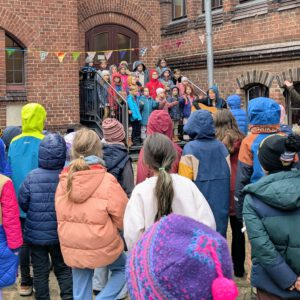 Die Sonne scheint auf die neuen schönen Spielgeräte und der Hof wird immer voller zu unserem kleinen Hoffest für die Einweihung. Doch gerade als der Chor anfängt zu singen, beginnt es zu regnen… Aber zum Glück sehen unsere neuen Spielgeräte auch im Regen schön aus…