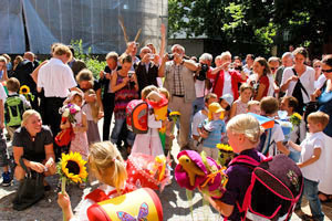 Nach dem feierlichen Gottesdienst gab es viel Grund auf dem Schulhof zu feiern, sich über den Besuch von Verwandten, die Schultüte, das tolle Sommerwetter und den Anblick von 48 aufgeregt glücklichen Kindergesichtern zu freuen.