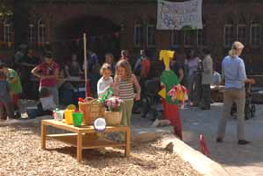 …war unser Schulhofeinweihungslied an diesem sommerlich strahlenden Montag Nachmittag in Babelsberg. Anlass zur Freude gab es wirklich viel – der Hof hat sich seit Ostern zu einem wirklich wunderbaren Spiel, Bewegungs- und Rückzugsort für Kinder entwickelt. Im Zentrum steht das von den Kindern heiß ersehnte Bauhaus, dass unser Klettergerüstbaukünstler Herr Meyer mit viel Liebe zum Detail in den letzten Wochen gebaut hat. Die Erstürmung von 100 Kindern hat es schon mal gut überstanden!