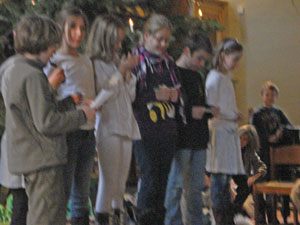 Unseren Weihnachtsgottesdienst feierten wir am 22.12.2011 in der Friedrichskirche am Weberplatz. Orchester und Chor stimmte uns mit dem wunderschönen Lied vom Licht ein. Die grünen Leffumaks führten die Geschichte „Die vier Lichter des Hirten Simon“ auf. Der Hirte Simon macht sich mit seinen vier Lichtern auf die Suche nach seinem verlorenen Lamm. Auf seinem Weg verschenkt er seine Lichter denen, die Hilfe brauchen. Völlig erschöpft von der langen Suche findet er schließlich sein Lamm im Stall, neben der Krippe. Und da wird es plötzlich auch hell um ihn. Weihnachten wird es hell in der Welt. Aber Gott braucht auch uns als Lichtträger. So bekam jedes Kind zum Abschluss ein eigenes Kerzenlicht mit nach Hause.