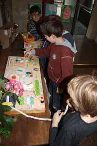 Aus der Geschichte des Schriftstellers Günther Herburger („Birne im Weltraum“) entwickelte Jürgen Reichen („Lesen durch Schreiben“) eine anspruchsvolle und fantasiereiche Werkstatt. Die Leffumaks waren schon nach wenigen Werkstattstunden „Feuer und Flamme“ für das Abenteuer der beiden Hauptfiguren. Viele Texte entstanden, Weltraumraketen und Kontrollpulte wurden konstruiert, Denkaufgaben gelöst und Zeichnungen angefertigt. Einige Wochen wurden die Arbeiten im Foyer ausgestellt und mit leuchtenden Augen von den Kamuffeln bestaunt. Die Schüler der 3. Klasse haben dem “Erfinder” der Birne-Werkstatt einen dicken Brief mit vielen Fotos zugeschickt und hoffen nun auf Antwort.