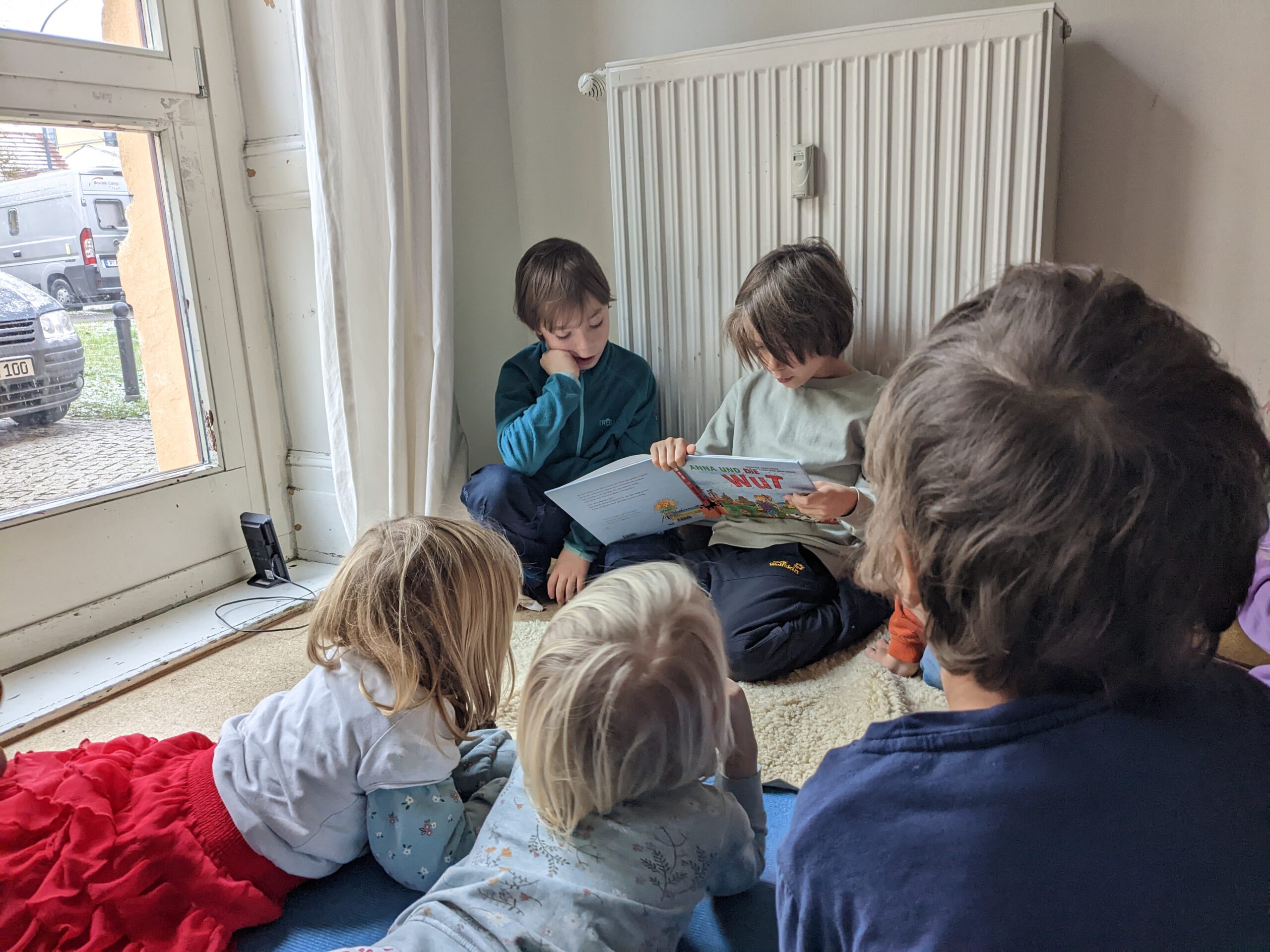 Darüber hinaus besuchten uns einige besondere Gäste: Britta Nonnast las uns aus ihrem Manuskript zum bald erscheinendem Buch „Käse im Weltall“ vor. Gudrun Lenz zeigte uns anschaulich, wie Bilder in die Bücher kommen und stellte ihre eigenen Arbeiten u.a. aus Märchen, Wimmelbildern und Schulbüchern für Biologie und Sprache vor. Paul Reinke teilte aus seinen Büchern tierische Freundschaftsgeschichten mit uns. Mascha las gemeinsam mit Frau Reinke zweisprachig Ukrainisch – Deutsch aus dem Buch „Erstaunliche Abenteuer in der Waldschule“ vor. Bei Herrn Paelicke gab es viel zu lachen beim Vorlesen des Buches „Der Tag an dem die Oma das Internet kaputt gemacht hat“ von Marc Uwe Kling. Mit der Illustratorin Lena Ellermann ging es gefühlvoll in das von ihr gestaltete Buch „Das kleine Ich auf der Suche nach sich selbst“. Gemeinsam mit Besucherkindern der Wilhelm-von-Türk-Schule und Oberlinschule und der Übersetzerin und Verlegerin Anna Mohos gab es eine zweisprachige Märchenvorlesezeit in Gebärden und Deutsch. Einige Kinder besuchten die Kitas Hoffkids, Comenius und Geolino und lasen Kitakindern vor. Andere Kinder besuchten das Omi-und Opihaus und lasen dort bei einem leckeren Stück Kuchen Geschichten vor. Die orangen Leffus gaben uns Einblicke in ihr Buchprojekt „Die Schule der magischen Tiere“ und am Lagerfeuer konnte man Witzen und anderen Geschichten lauschen.