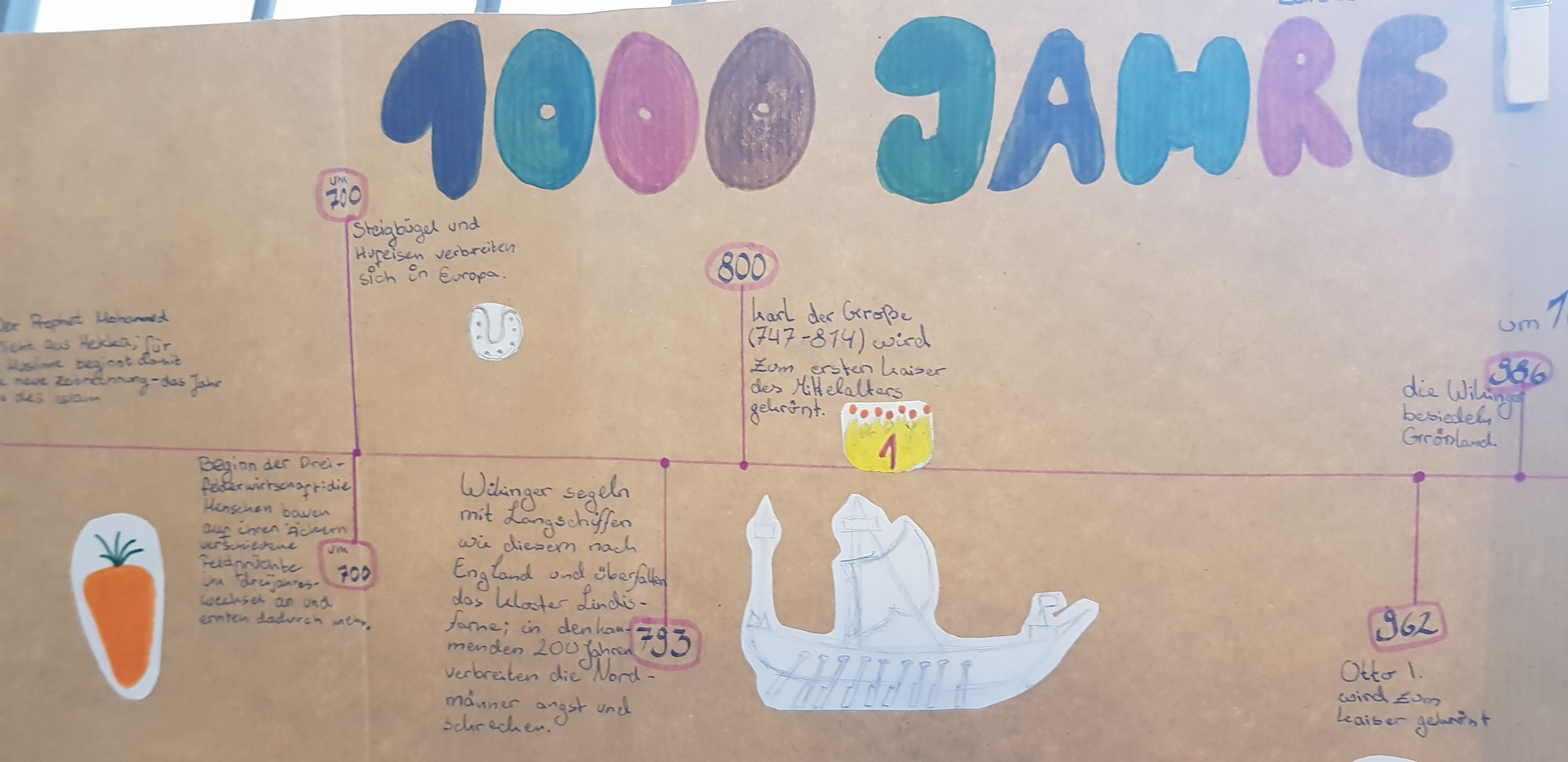 Unsere Projektwoche wurde am 5.5. mit einer Andacht und einer Ausstellungs- und Schnupperzeit beendet. In den Tagen zuvor haben sich über 300 Kinder mit dem Leben in dieser Epoche beschäftigt. Es wurde gekocht, geschmiedet, im Skriptorium geschrieben, Kirchen besucht, in der mittelalterlichen Ausstellung in Magdeburg gearbeitet, genäht, das mittelalterliche Dorf Düppeln besucht, Werkszeuge, Burgen und Schilde gebaut, Zeitstrahl und Lehnspyramide erstellt, recherchiert, gesungen, gespielt, gemalt und und und…