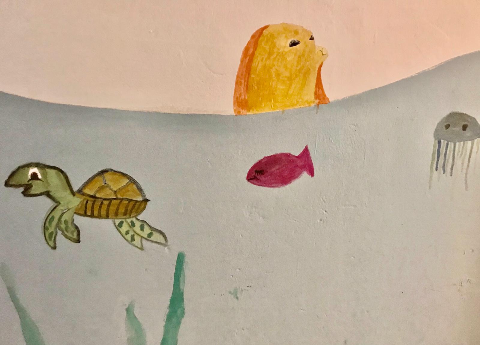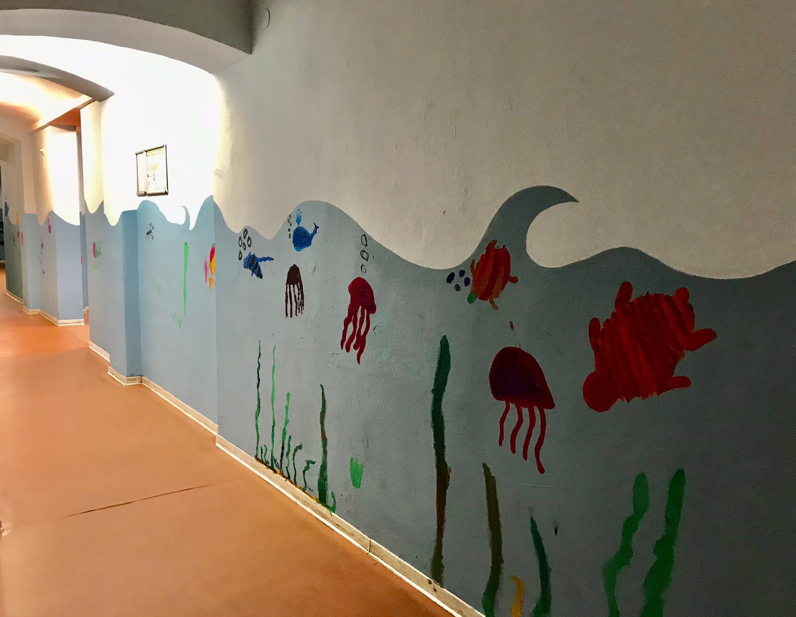 Es blubbert, kriecht, schwimmt und wächst in der Garderobe der Evangelischen Grundschule Babelsberg. Nachdem der Flur der Garderobe neu gestrichen wurde, brauchten das aufgemalte Meer und seine Wellen noch BewohnerInnen. Ganz nach Pablo Picassos Zitat „Jedes Kind ist ein Künstler“, haben die Kinder die Gestaltung der Meereswelt übernommen. In ihren Kohorten zeichneten sie erst eine Skizze, die sie danach mit Farben an die Wand brachten. Herausgekommen ist ein gemeinsames, großes, meterlanges Flur-Gemälde, das die unterschiedlichsten BewohnerInnen beherbergt. Da treffen Quallen auf Krebse, Robben auf Orcas, Schildkröten auf Regenbogenfische und Kraken auf Seesterne. Und mittendrin wabert ein Unterwasservulkan und Seegras bietet den MeeresbewohnerInnen Platz zum Verstecken. Jedes Kind konnte sein eigenes kleines Kunstwerk schaffen und Teil dieses gemeinsamen Projekts werden, dass uns besonders zu Coronazeiten zeigt, dass wir als Schule immer noch ein Team sind. Denn Gemeinschaftsgeist lässt sich auch in Kohorten leben.