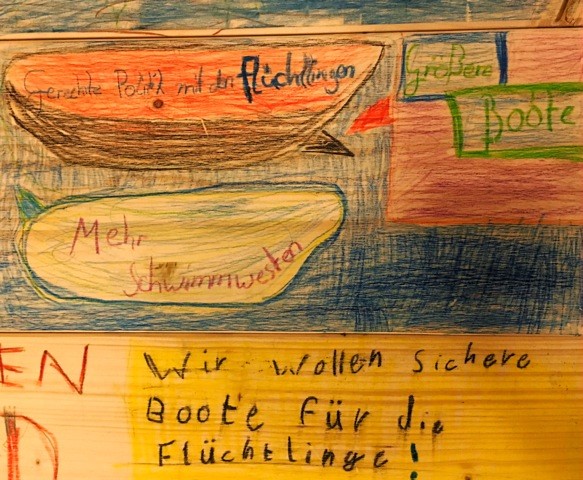 Zuvor haben die Kinder gemeinsam u.a. zu den Begriffen Heimat, Heimat finden, Heimweh, Heimat suchen gearbeitet. Dabei kam der große Wunsch der Kinder auf, für die Flüchtlinge was Gutes machen zu wollen. Dazu haben die Kinder 31 Planken bunt bemalt und mit Forderungen an die Politiker gestaltet. Diese Planken werden mit vielen anderen Planken aus dem gesamten Bundesgebiet zu einem symbolischem großen Boot gebaut, das am 20. Juni 2016 vor dem Europaparlament in Brüssel auf die dramatische Situation der Flüchtlinge aufmerksam machen soll, die über das Meer kommen.